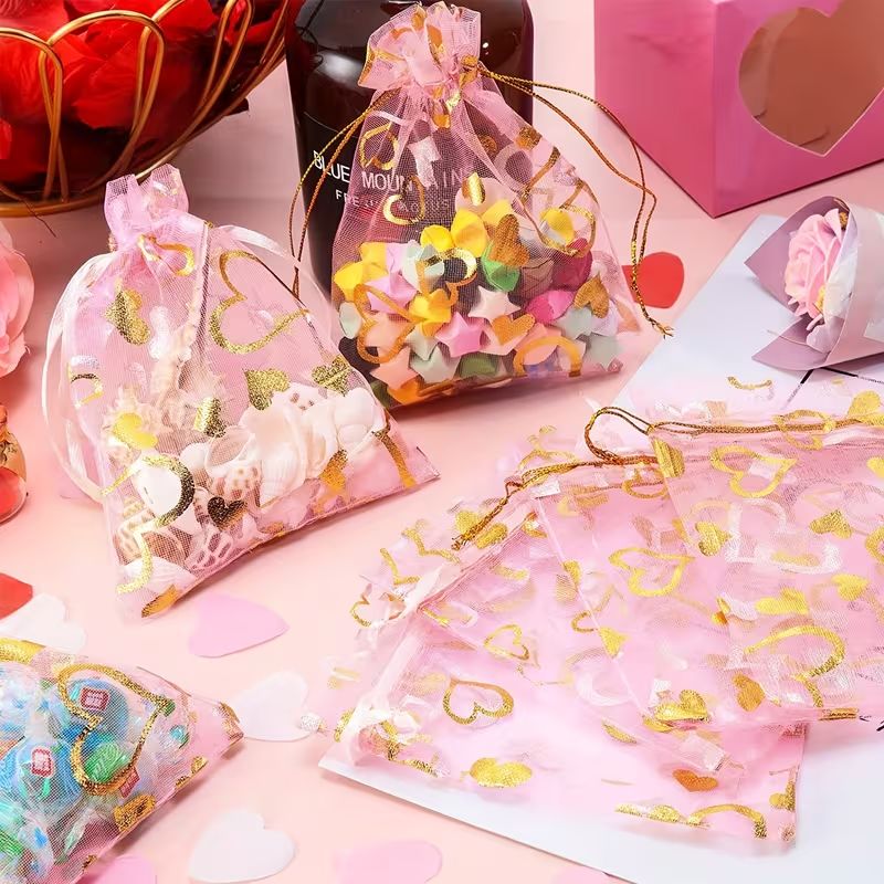 - Естетична упаковка подарунків: Моделі, прикрашені золотими та срібними серцями, виглядають по-справжньому ошатно та святково. Це неймовірно красиво: мерехтливий принт на ніжній сітці створює ефект дорогої та продуманої презентації. На відміну від паперового пакета, який одразу викидають, така сумочка сама по собі є цінним подарунком. Одержувач із задоволенням залишить її для зберігання улюблених прикрас або пам'ятних дрібниць.